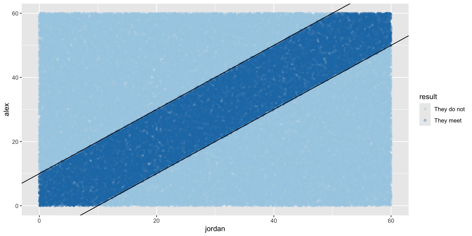 Consider a situation where Alex and Jordan plan to meet to study in their college campus center (Mosteller 1987; Baumer, Kaplan, and Horton 2021). They are both impatient people who will wait only 10 minutes for the other before leaving.