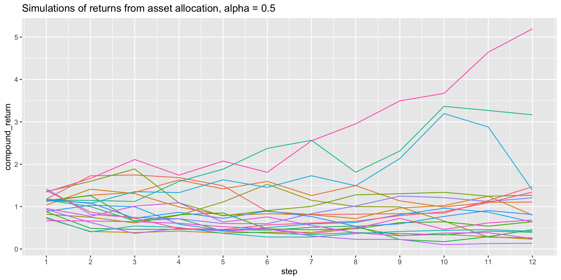 labs(title = "Simulations of returns from asset allocation, alpha = 0.5")